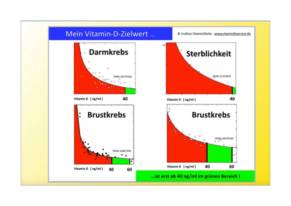 Une étude américaine montre qu’en dessous de 40ng/ml le risque de cancer augmente de manière conséquente, même chez les gens qui vivent « sainement » sans tabac, sans alcool.